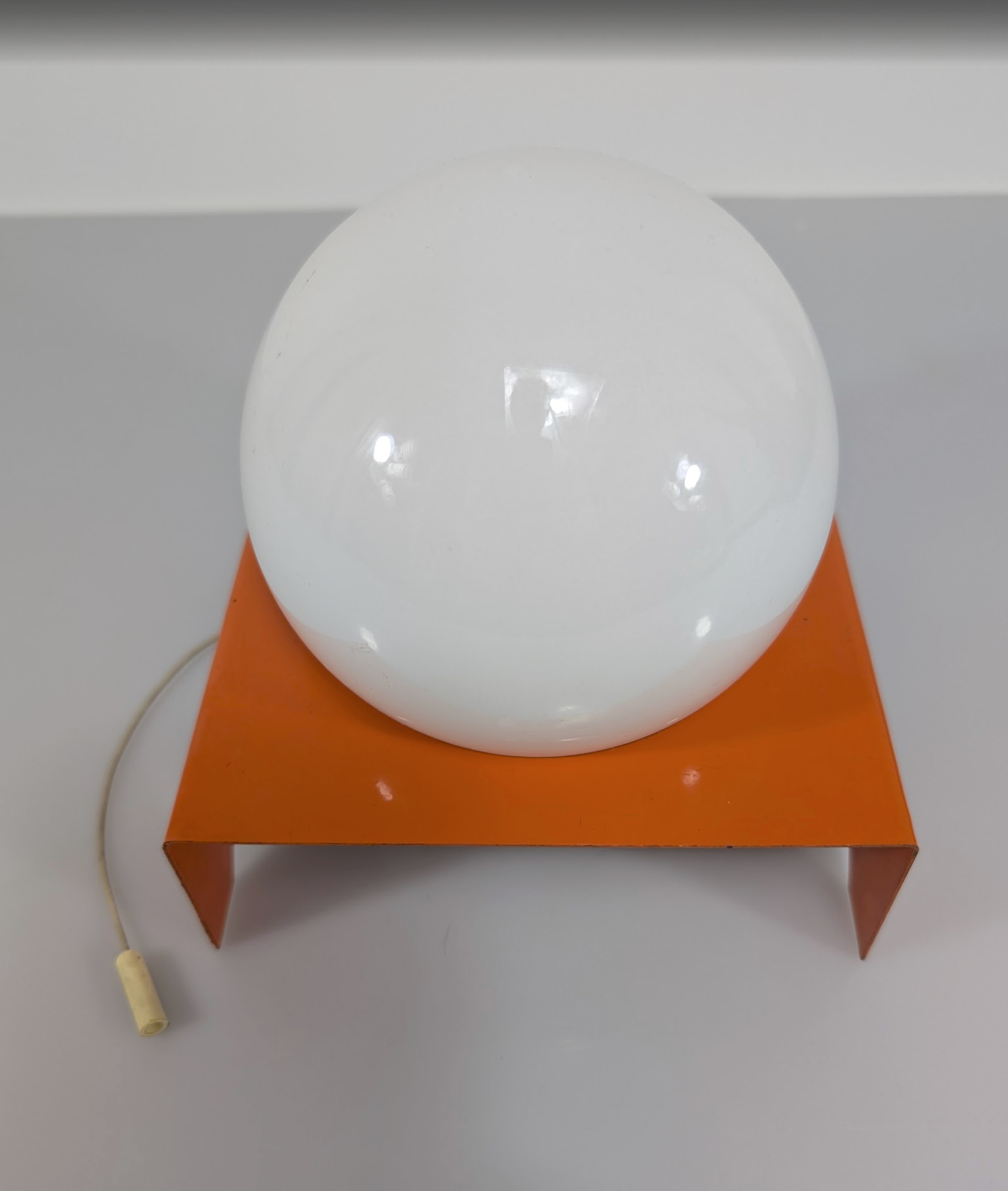 Base : 14 x 14,5 cm. Boule opaline de diamètre 11,5 cm. Interrupteur en état de fonctionnement avec son fils et son extémité d’origine.